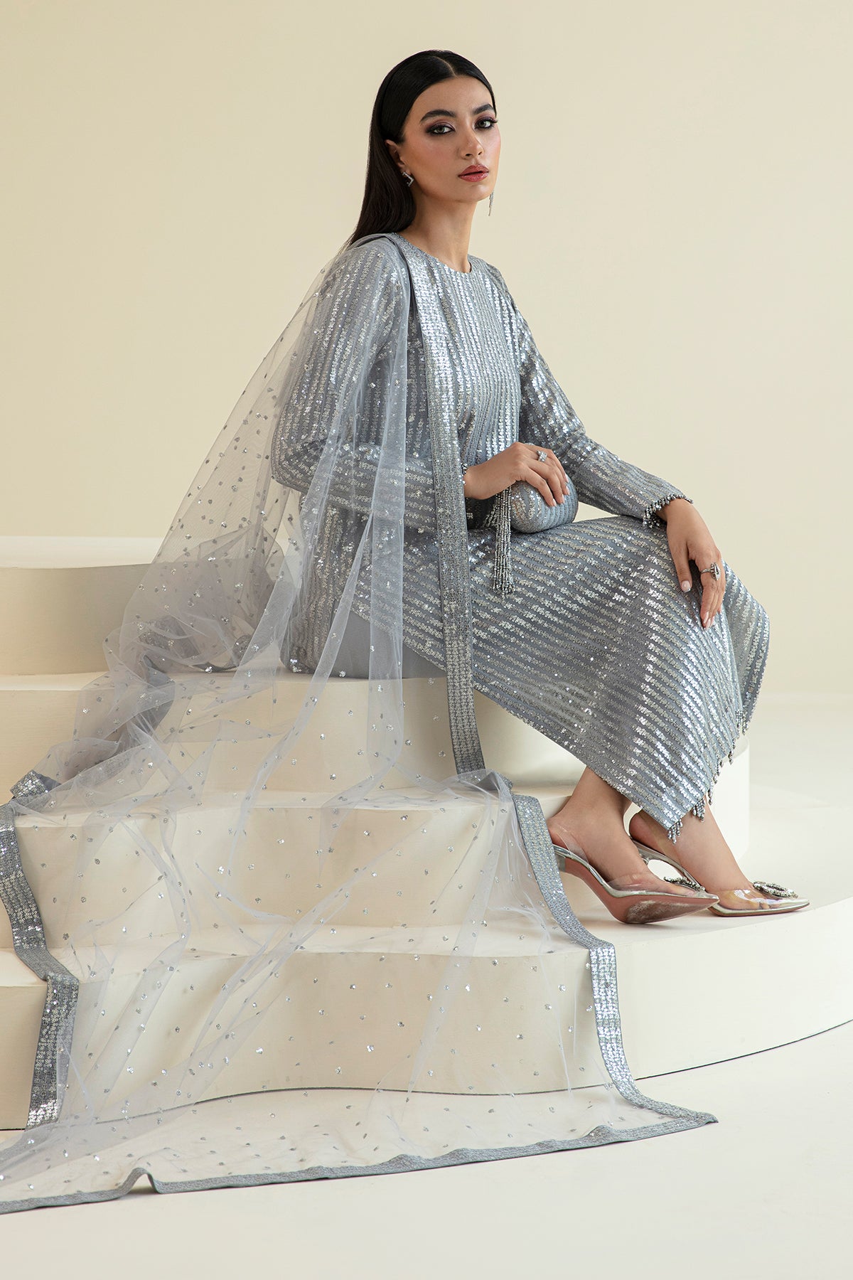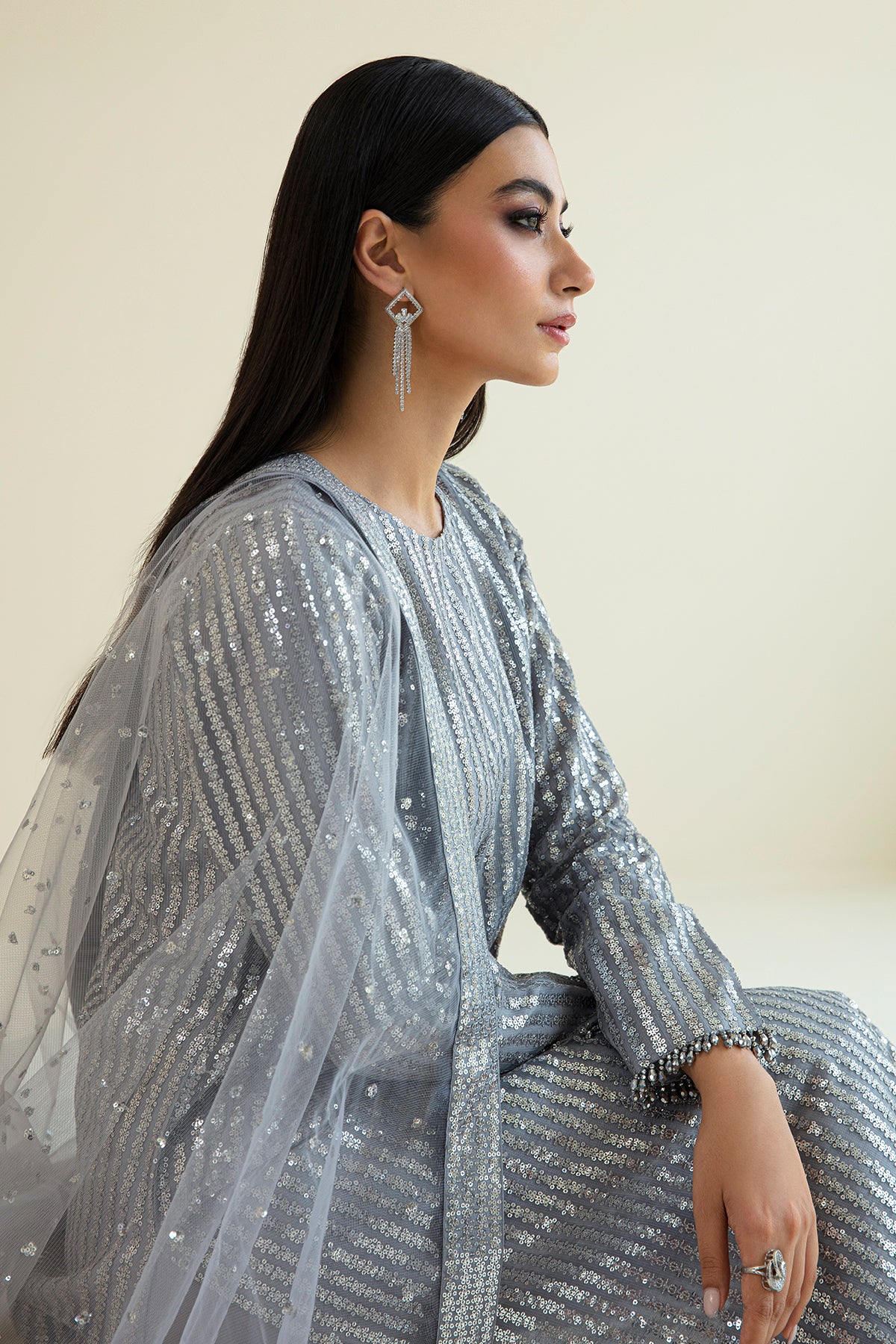 Luxury Heavy Sequence Embroidery 3PC Silver